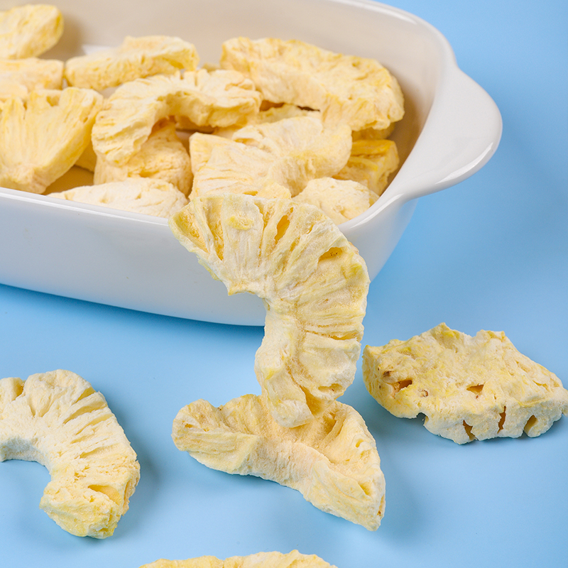 新鲜菠萝,采用FD工艺制成菠萝脆,锁住新鲜,锁住美味,使菠萝脆保持原有的色、香、味、形,原滋原味,酥脆爽口,果香四溢,齿颊留香。