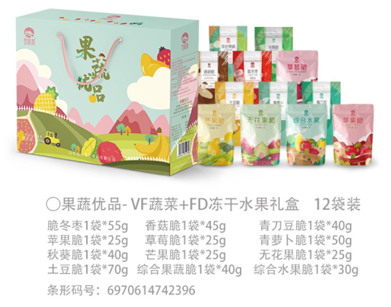 果蔬优品礼盒,涵盖十二种果蔬脆,一份礼盒,十二份心意,果蔬自然的香气与酥脆的口感,小清新高颜值的设计,作为礼品,更是一种别出心裁的选择,在朋友聚会,家庭团聚中是出其不意的小惊喜,符合年轻一代的消费观念与审美,是好友之间互达情谊的潮流之选。